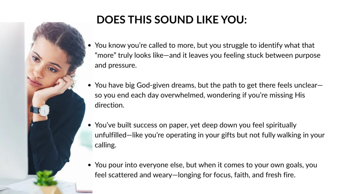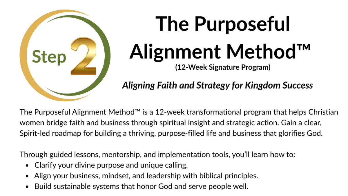 Our unique Purposeful Alignment Method™ equips you to integrate your faith into your work so you don’t have to choose between being spiritually grounded and professionally successful.